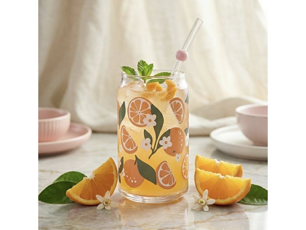 Představuji vám skleničku Orange Sunshine – kousek, který do vašeho dne vnese okamžitou vlnu energie a optimismu. Tento autorský design plný šťavnatých pomerančů, něžných květů a svěžích lístků je stvořen pro to, aby každý váš drink chutnal jako kousek léta.